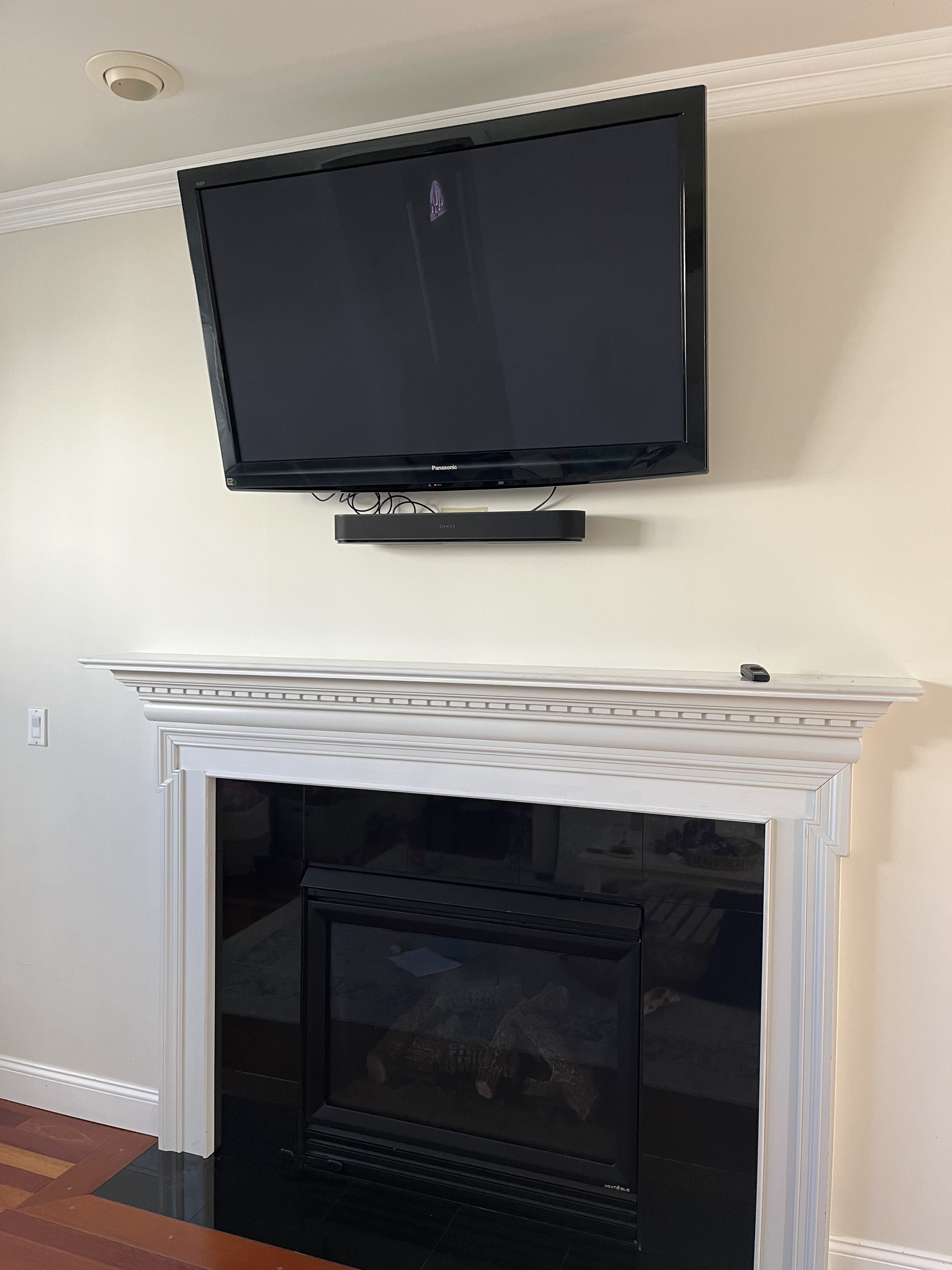 - Installation can be costly: I didn’t realize that installing a Frame TV in our space would be such an ordeal, but it required a lot of work and expense to set up properly. I should note that I think our situation was on the extreme end. Most people don’t go through the process that we did for the installation, but definitely think through how you’re going to set things up before you buy this type of TV and determine if it’s the best fit for you. The main consideration: where are you going to put the control box (i.e. the “One Connect Box”)–the box that provides one connection hub for all cables? In our case, we chose to mount the TV above the fireplace and although we have a mantel, we have no built-ins or furniture around that wall. This meant we didn’t have anywhere to put the control box that wouldn’t be super obvious. As a solution, we decided to run the wires through the wall and have the control box sit on a shelf in our basement. This required the work of an electrician to set up, and a handyman to repair and repaint the affected walls. In other words, it was an investment! Most people choose to simply have the box sit in a media cabinet or on a built-in shelf under the TV, which is a much, much easier and cheaper route if you have that option.