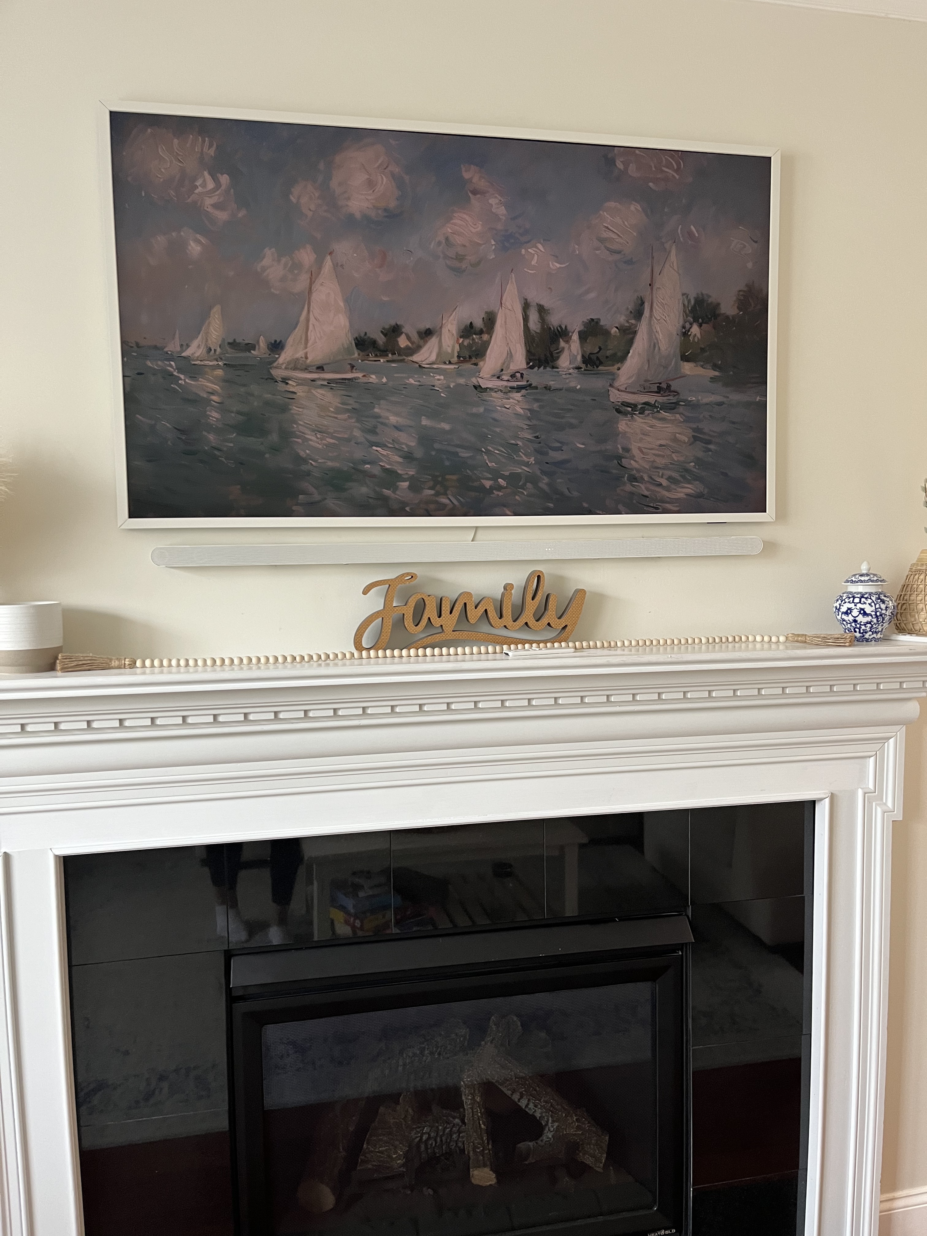 - Customization options: Once you have the TV installed, you can switch up the look by swapping out different frame styles. The frame pieces are magnetic and snap on and off easily. As for the art itself, there are SO many options to suit any style, mood, season, etc. When I’m sick of the current art, I just go onto Etsy and find a new piece that fits the vibe I’m going for. It’s so fun being able to change the art during the holidays and to suit the different seasons. I’ve even put up special art when it was each kid’s birthday, and they got a kick out of that! Cost wise, the art is very cheap, at least on Etsy where I buy it.